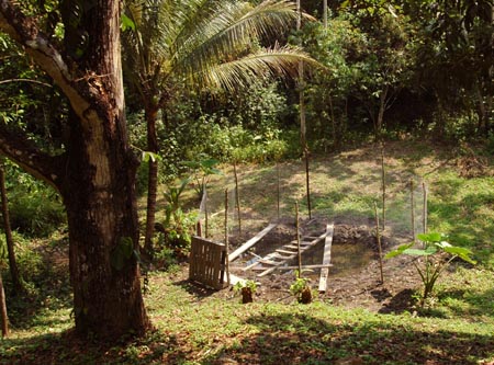Most mountainous jungles have several natural springs, or it is usually not too deep to find a water source and dig a well. A good spring can provide water year round. Our spring fortunately does not dry out! The best thing to do is isolate your spring to prevent wild life from contaminating it and add some fish which will eat mosquitoes and their larva or bacteria in the water. If you are lucky enough to have a spring above your holding tank, than all you have to do is install a pvc line and gravity will take care of filling up your tank. If not, as in our case, you need to run a line from the spring to your tank and use a water pump. You can get an electric or gas water pump, depending on your situation (is there an available power supply near your spring?). Keep in mind that a gas water pump is much more versatile.